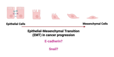 Primary Image: A molecular mechanism of Epithelial to Mesenchymal Transition (EMT): An evidence-based lesson applying molecular biology through the lens of cancer. Cancer cells undergo many cellular changes during the Epithelial to Mesenchymal Transition (EMT), which promotes one of the hallmarks of cancer: tissue invasion and metastasis. One mechanism of EMT involves the proteins E-cadherin and Snail.